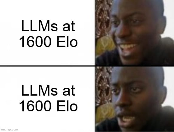 I had the following realization: imagine if Stockfish didn’t exist. What if all we had were LLMs? In the quest to have computers be competitive with humans at the game, there is quite a likelihood that focus would be on fine-tuning and prompting these models