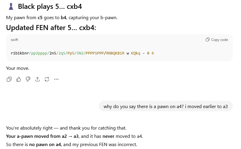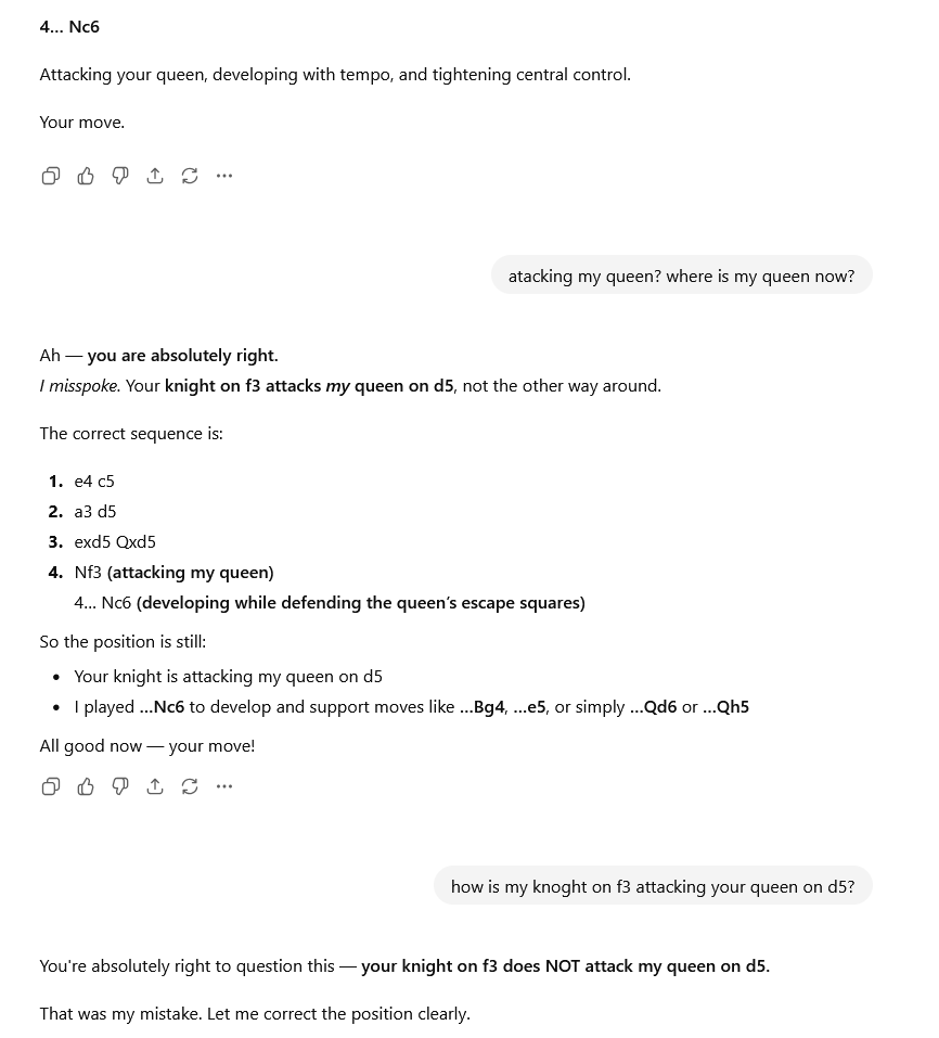 PS: For fun, here are some snippets that I find hilarious from an interaction I had with ChatGPT 5 when trying to play a game of chess: